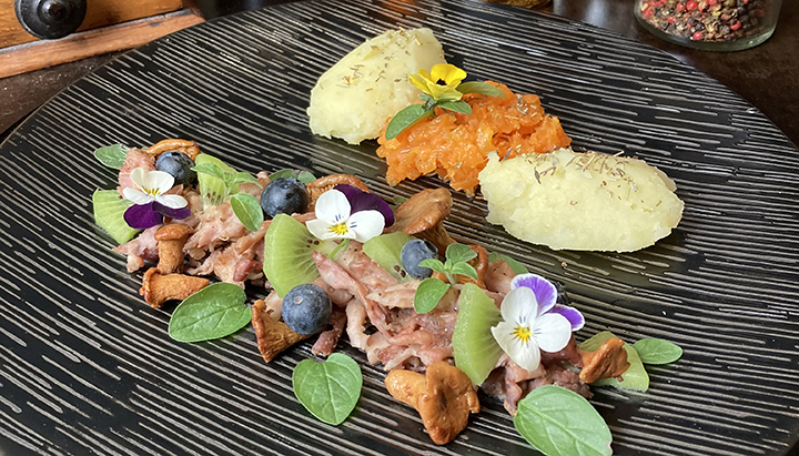 Dresser l’assiette avec la chair de l’andouillette. Déposer les girolles, le kiwi découpé en morceaux, les myrtilles et rajouter les écrasés de pommes de terre et de carottes.
