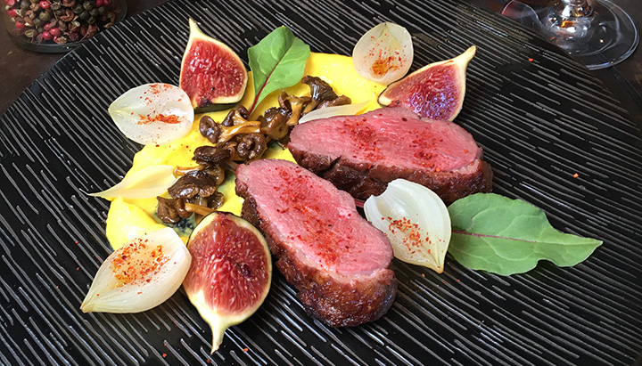 Dressez l’assiette avec la crème de poivron, déposez le magret et les girolles. Découpez en quartier les figues et les oignons et disposez-les autour des magrets.