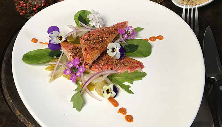 Dressez l’assiette avec la crème de poivron et la fondue de poireaux. Déposez les filets de rouget. Décorez avec l’oignon émincé et la roquette.